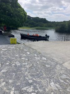 the lily of killarney watercoach. behind the sign is the waterbus docked on the pier