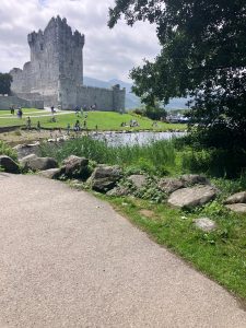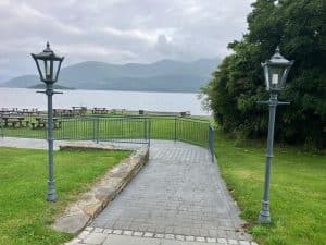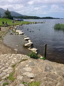 a rocky terrain, below is well maintained grass before overlooking the lake